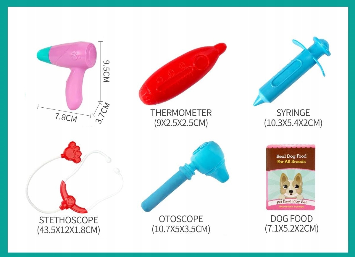 Zestaw jest idealnym prezentem dla małych weterynarzy. Sprawi na pewno mnóstwo radości we wspólnej zabawie i dużym i mały. Bardzo kolorowy i efektowny sprawdzi się w niejednej, domowej przychodni weterynaryjnej.